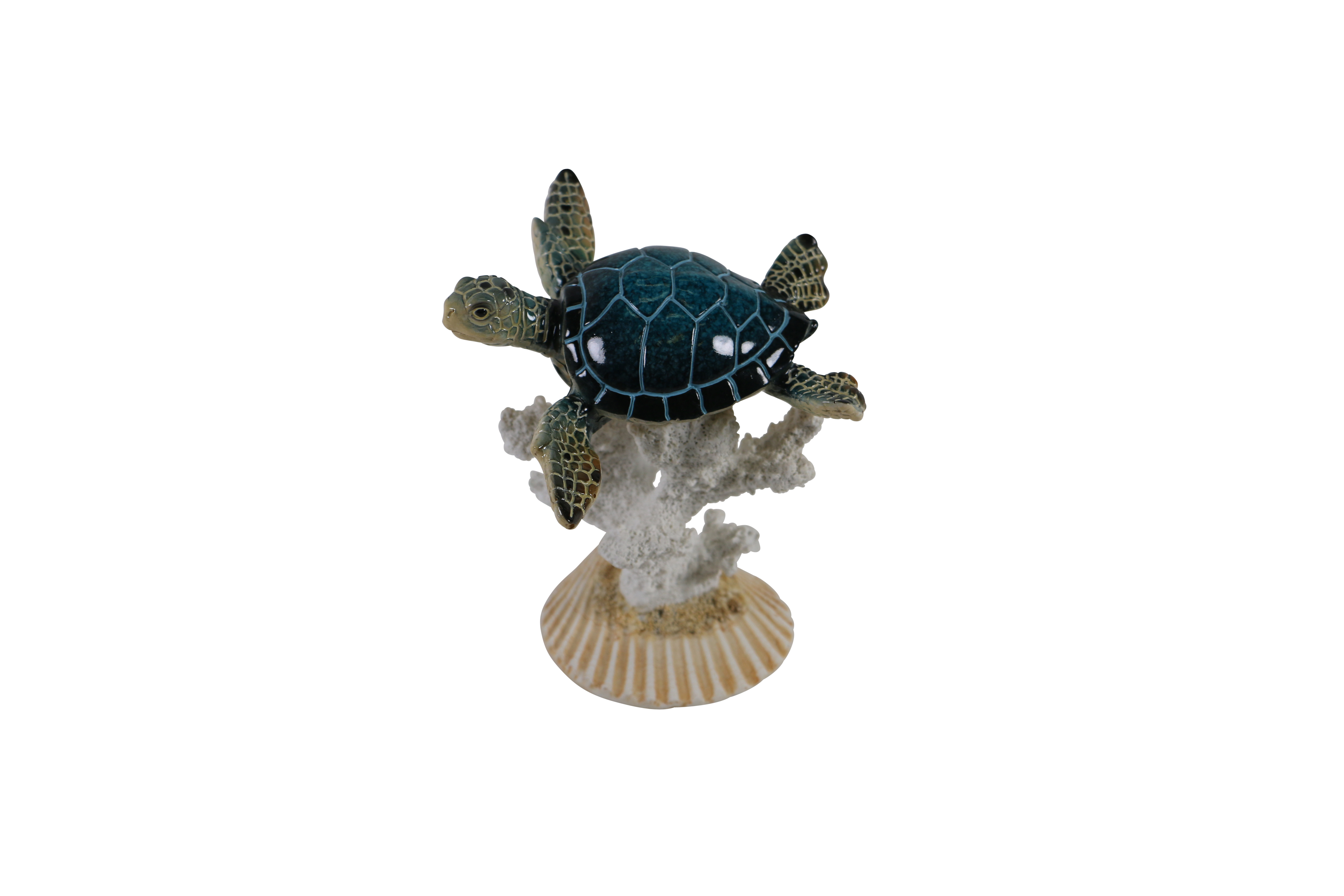 Blue turtle on white coral and shell base